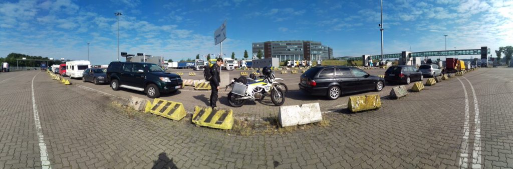 Dann gehts los die knapp 10 km bis zum Skandinavienkai. Und man soll nicht behaupten, dass man sich auf 10 km nicht verfahren kann. Wir schaffen es natürlich trotzdem pünktlich. Vor uns eine Schlange, aber alles überschaubar.