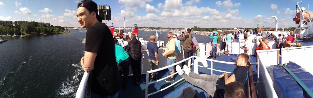 Die meisten Passagiere sind russische und lettische LKW Fahrer, die offenbar froh sind, einen Tag nicht fahren zu müssen. Und die Gelegenheit nutzen, den Alkoholreserven der Fähre stark zuzusetzen. Alles bleibt friedlich, wenn auch lautstark 😉