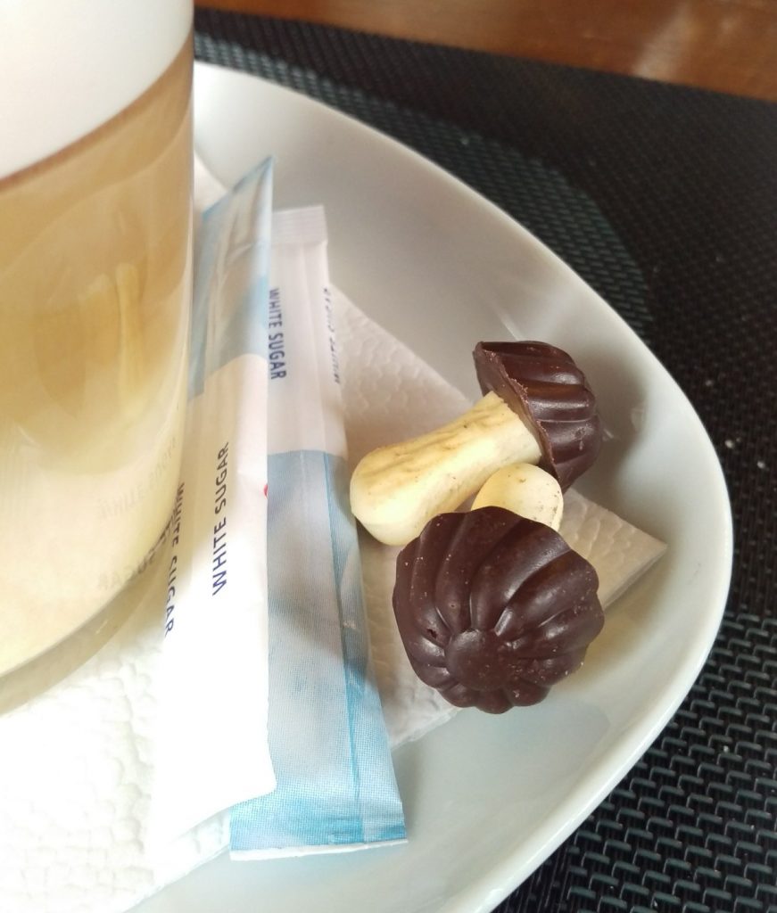 Völlig unscheinbar von außen, aber zur Mittagszeit gut gefüllt. Und der Kaffee ist ebenfalls gut und wird mit Pilzen serviert.
