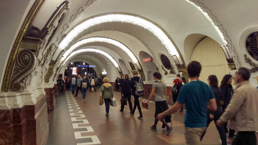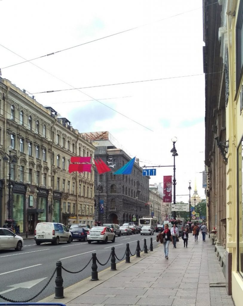 Wir fahren mit einem kleinen Bus der Linie 405 über den Ostdamm hinein in die Stadt. Es sind ca. 30 km, die wir zurück legen. Das zieht sich. Raus gelassen werden wir an der Metrostation Чёрная речка, zu deutsch „schwarzer Fluß“. Zwei Stationen mit der Metro, dann sind wir im – touristischen – Zentrum der Stadt angelangt, am Newski Prospekt. Der Name entstammt der ursprünglichen Verbindung, die diese Straße zwischen dem Admiralsplatz und dem Alexander-Newski-Kloster herstellte.