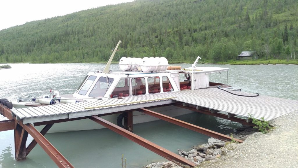 Halbwegs gestärkt fahren wir los. Es ist nicht so weit, ca. 30 km. Dann erreichen wir den Svartisen See, in den der Gletscher entwässert. Es gibt eine Art Kiosk, einen Parkplatz und eine Bootsanlegestelle. Wir ziehen uns um, heute ist ja wandern angesagt. Die Helme können wir freundlicherweise in der Hütte des Fährmanns lassen.