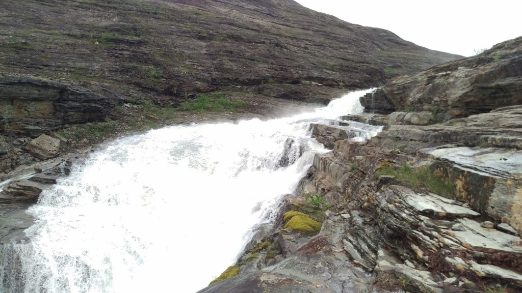 Langsam kommt der Ausstiegspunkt am Westufer des Sees in Sicht. Dort beginnt der ungefähr 3 km lange Aufstieg Richtung Gletscher. Vorbei an einem recht beeindruckenden Wasserfall.