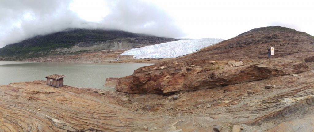 Heute soll es zum Gletscher gehen, zum „Schwarzeis“ Gletscher. Das ist der zweitgrößte Gletscher Norwegens, der größte ist der Jostedalsbreen deutlich weiter südlich. Aber vorher natürlich frühstücken, dazu müssen wir einen großen Bogen fahren, unser Frühstück liegt auf der anderen Seite der Stadt. Irgendein Architekt hat nämlich beschlossen, die Stadt längs mittels einer Bahnlinie zu teilen. Kommt man vom Wasser, kann man nur unter den Gleisen am Bahnhof die andere Hälfte der Stadt erreichen. Rechts und links muss man lange laufen bzw. fahren, um den nächsten Übergang zu erreichen. Seltsames Design.