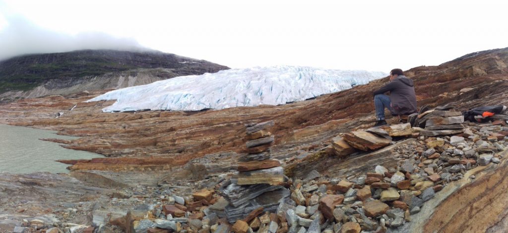 Bis hierher war der Weg halbwegs gebahnt und mit Steinmänchen markiert. Aber ab hier ist nicht mehr viel u sehen, und die letztem 100 Meter haben uns gezeigt, dass es nicht so einfach sein würde, bis ganz heran zu kommen. Wir entschließen uns, nicht weiter heran zu gehen und den Gletscher von hier aus auf uns wirken zu lassen – was auch gelingt.