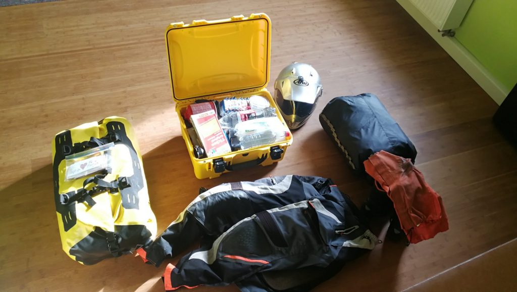 Jetzt sind es 3 Gepäckstücke. Jedes nicht zu groß, und halbwegs sinnvoll verteilt: links Zelt, Schlafsack, Isomatte, Teile des Proviants. Im Packsack die Klamotten, im Koffer der Rest. Das Ergebnis sieht so aus: