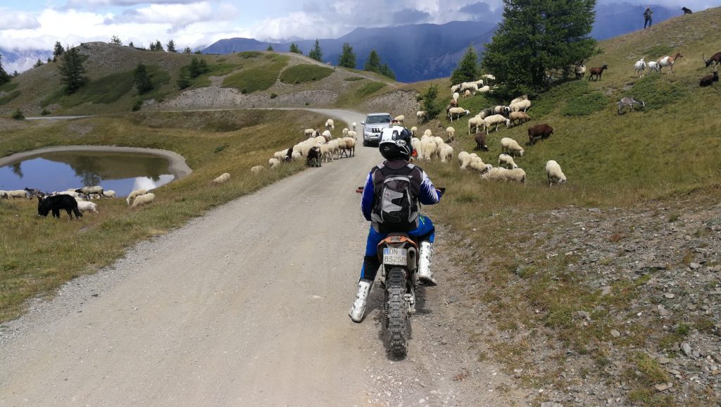 Auch hier fährt das Auto weniger als Schritt, die Moppeds lassen gemächlich mit ausgeschaltetem Motor rollen. Damit der Hütehund weiter auf der Straße liegen und den Schafen beim Weiden zusehen kann.