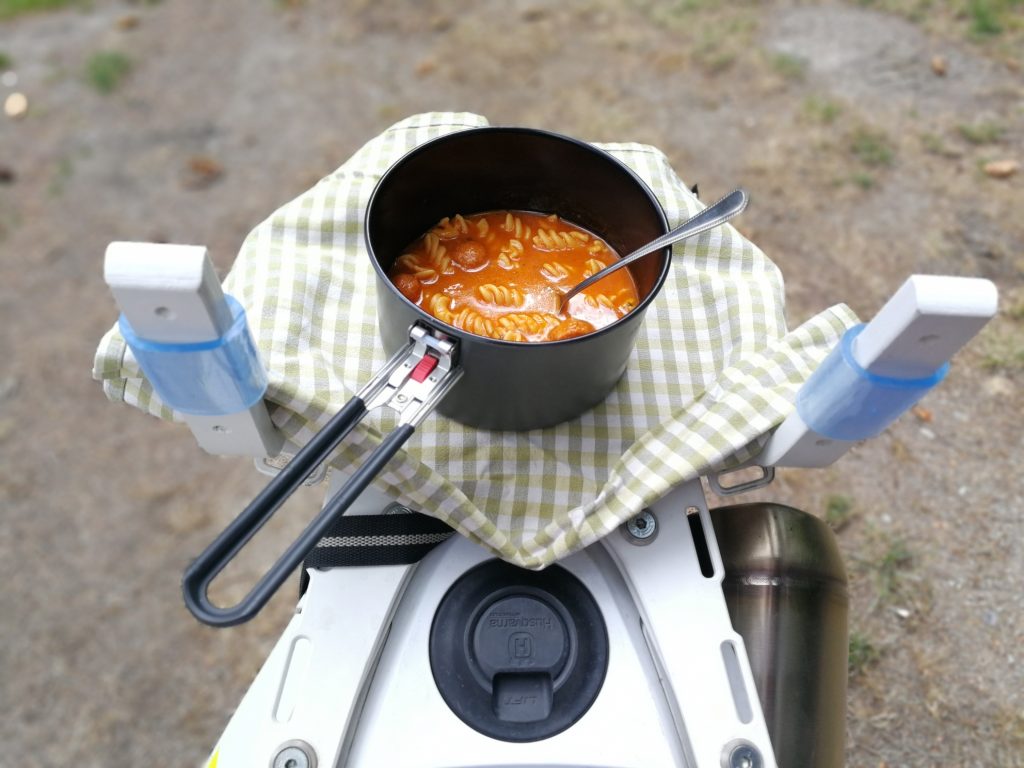 Ich freue mich auf die Pause in „meinem“ Camp-Restaurant. Bis zur abendlichen Erkundungstour gibt es noch Nudeln mit Fleischbällchen. Merke: hast du ein Mopped, brauchst du keinen Campingtisch.