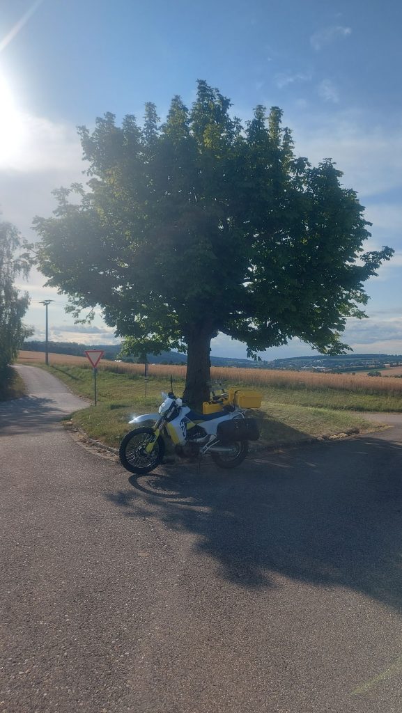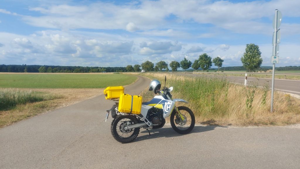 Das Wetter ist, gemessen an letzter Woche mit ihren 40°C, ideal. Fast ein wenig zu kühl. Aber trotzdem super. Nach 75 km mache ich den ersten Stop, um zu kontrollieren, ob der Campingsack zu heiß wird – er ist ja auf der Auspuffseite angebracht. Wir er aber nicht, also alles gut.