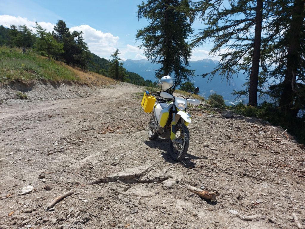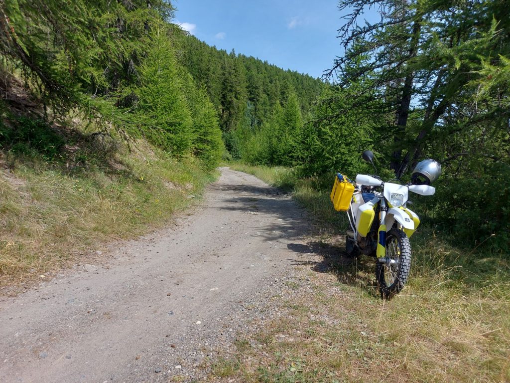 Unten wieder auf der N94 angekommen suche ich eine Möglichkeit, eine Kleinigkeit zu essen. Fehlanzeige. Dafür treffe ich auf einem Parklpatz eine Ehepaar, die mit einem Wohnmobil und Hänger unterwegs sind. Auf dem Hänger zwei Mountainbikes und zwei KTM-Enduros. Sie erzählen, dass sie im Susatal schon alles gefahren sind, man ihnen aber hier erzählt hat, dass es verboten wäre, offroad zu fahren. Ich versichere ihnen glaubhaft, dass das nicht der Fall ist und zeige auf der Karte, wo ich überall gefahren bin die letzten Tage, ohne irgendwo unangenehm aufzufallen.