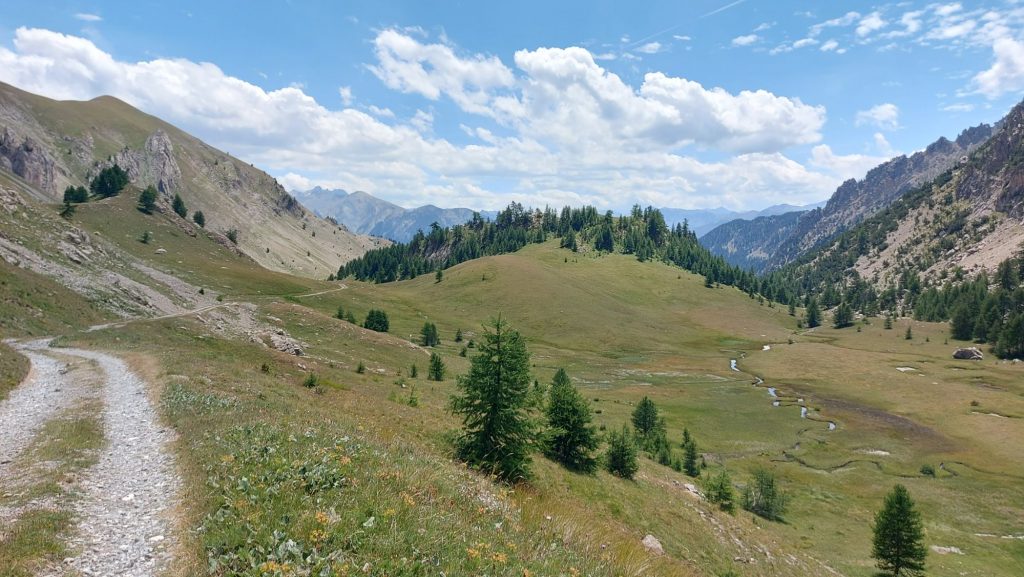 Ich entschließe mich dann, die zweite Route gleich anzuschließen. Sie soll mich zu einem Bergsee, dem Lac du Lauzet, bringen. Er liegt auf ca. 2200 Metern. Der Weg ist ähnlich anspruchsvoll wie der der ersten Tour heute. Es geht zügig nach oben, Schotter, Spurrinnen, Flüsschen, Geröll.