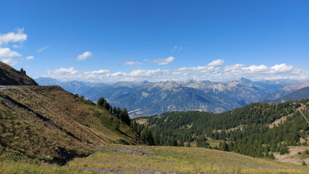 Ich hatte auf der Strecke mehrere Mountainbiker überholt. Kurz nach meiner Ankunft oben hat mich auch einer der Biker eingeholt. Er grinst. Ich rufe ihm zu: „C’est dure!“. Er lacht, sichtlich am Schnaufen, und erwiedert: „Un petit peu!“.