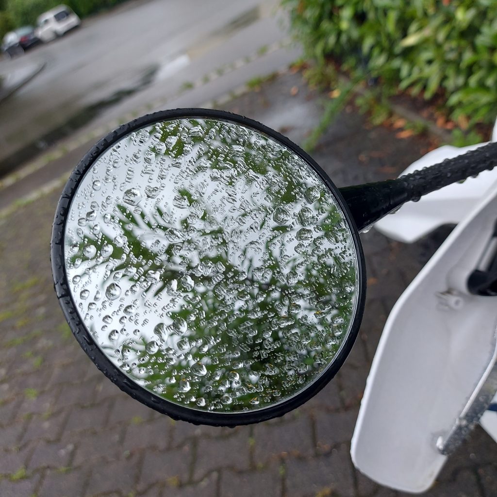 Dann breche ich auf, das Wetter tut so, als ob es sich beruhigt hätte. Das tut es genau so lange, wie ich nicht auf den Landstraßen nördlich des Bodensees unterwegs bin. Dann beginnt es kontinuierlich und ziemlich stark aus einem monoton grauen Himmel zu regnen. Das geht eine gute halbe Stunde so, dann spüre ich die Nässe auch schon durch die Kombi.
