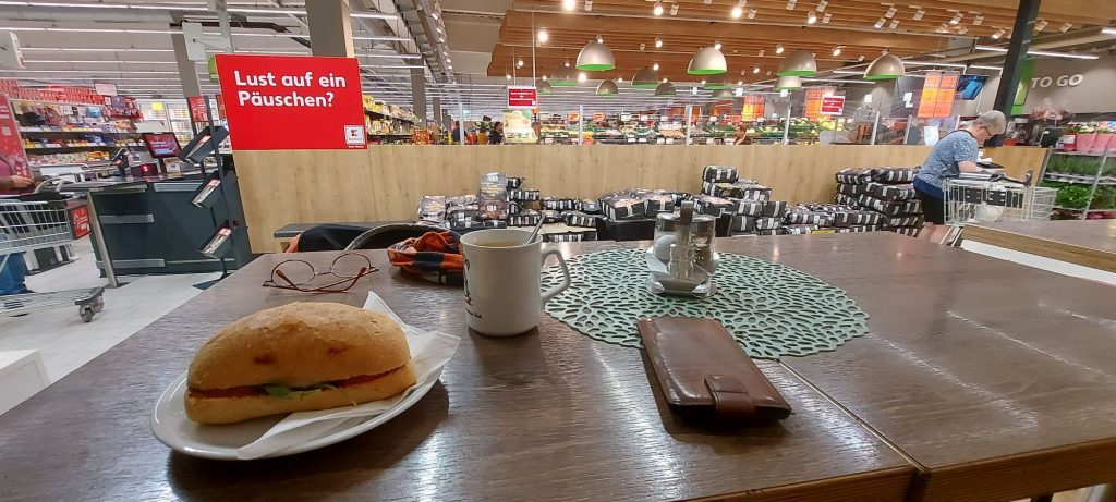 Allzuviel Auswahl habe ich nicht, also wird es der Bäcker im Kaufland. Ich beobachte die frühen Kunden, die Mitarbeiter, die Frau hinter der Bäckertheke. Und bin dankbar, dass ich woanders – und vor allem anders – arbeiten darf.